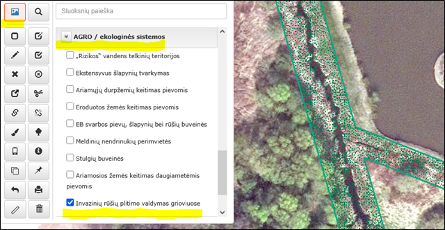 Pareiškėjas, PPIS erdvinių duomenų sluoksnių sąraše pažymėjęs sluoksnį „Invazinių rūšių plitimo valdymas grioviuose“ (šis sluoksnis elektroniniame žemėlapyje atvaizduojamas atsitiktine tvarka išdėstytais žalios spalvos taškais), įbraižo paramai tinkamą plotą ir lentelėje „Lauko informacija“ pasirenka Žemės ūkio naudmenų ir kitų plotų klasifikatoriaus kodą INZ („Invazinių rūšių plitimo valdymas melioracijos griovių šlaituose“).