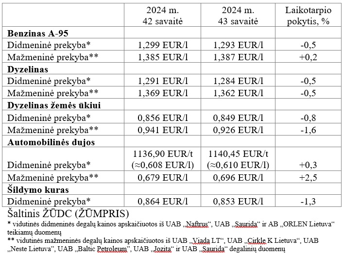 Vidutinės degalų kainos Lietuvos rinkoje 2024 m. 43 savaitę