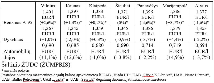 Vidutinės mažmeninės degalų kainos didžiuosiuose Lietuvos miestuose 2024 m. 43 savaitę
