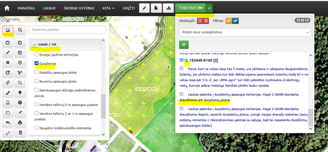 - susipažinimų sąraše susirasti mėlyną pranešimą, su kuriuo susipažinote prieš tvirtindami paraišką, pavyzdžiui, „Laukas patenka į durpžemių apsaugos teritorijas. Pagal 2 GAAB standartą draudžiama arti durpžemių plotus“,