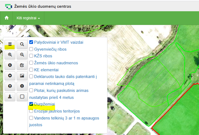 - tokiu pačiu būdu galite pasitikrinti ir į erdvinių duomenų sluoksnius „Erozijai jautrios teritorijos“ bei „Aplinkosaugos atžvilgiu pažeidžiamos pievos“ patenkančius deklaruotus laukus.
