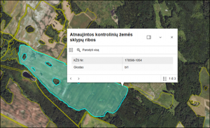 Pelės kairiuoju klavišu žemėlapyje paspaudę kontrolinį žemės sklypą (jis taps mėlynos spalvos), lentelėje „Atnaujintos kontrolinių žemės sklypų ribos“ matysite KŽS numerį ir KŽS atpažinties kodą.
