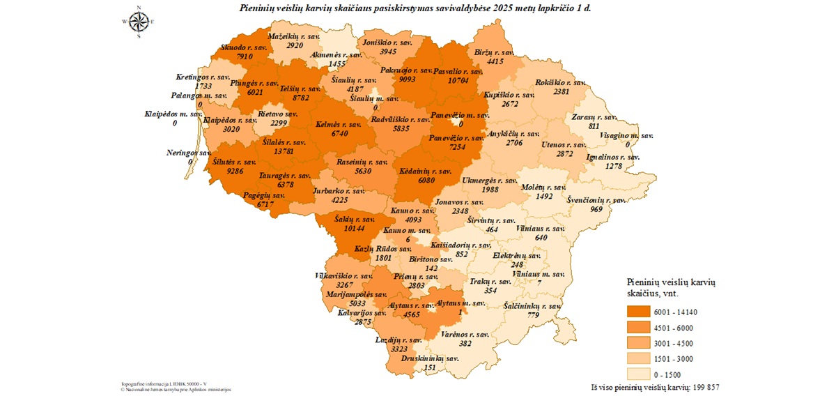 Pieninių veislių karvių skaičiaus pasiskirstymas savivaldybėse