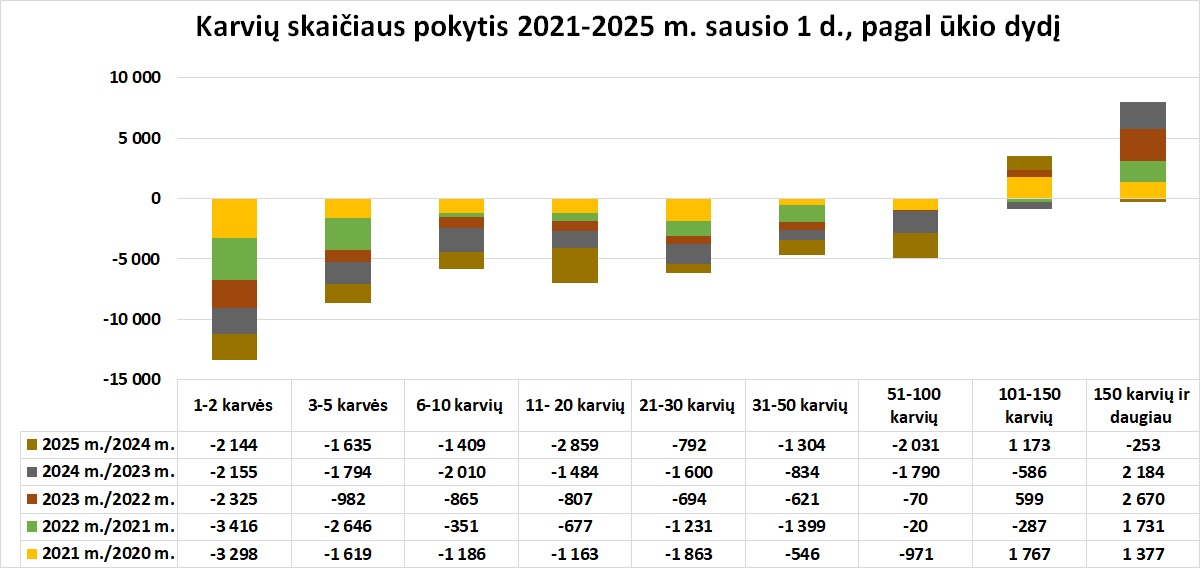 Karvių skaičiaus pokytis pagal ūkio dydį