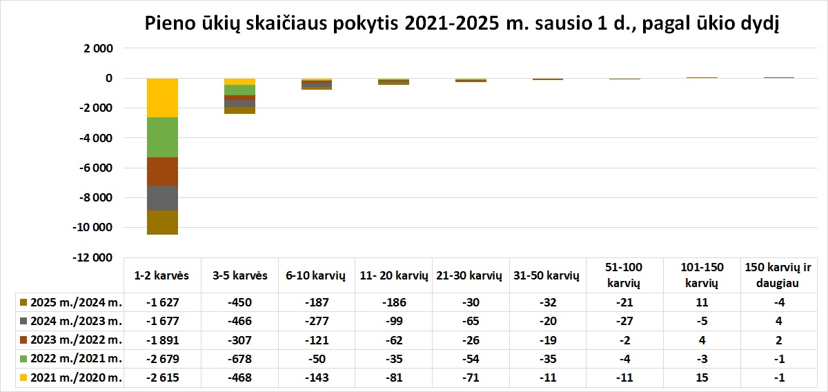 Pieno ūkių skaičiaus pokytis pagal ūkio dydį