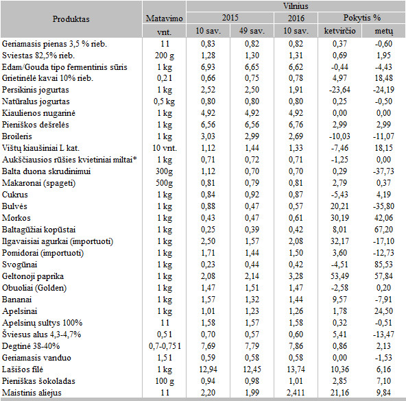 2016-04-04 – Mažmeninės maisto produktų kainos kai kuriose ES šalių sostinėse 2015 m. 10 sav. – 2016 m. 10 sav. (EUR)