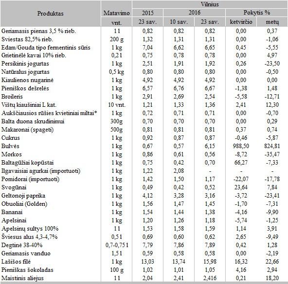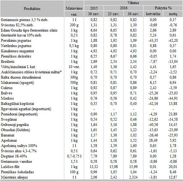 2016-10-03 – Mažmeninės maisto produktų kainos kai kuriose ES šalių sostinėse 2015 m. 36 sav. – 2016 m. 36 sav. (EUR)
