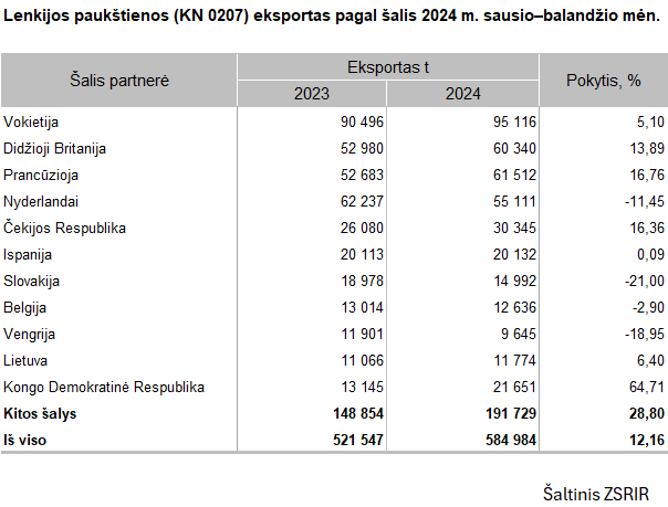 ZSRIR duomenimis, paukštienos eksportas Lenkijoje analizuojamu laikotarpiu sudarė 584,94 tūkst. t ir, palyginti su praėjusių metų tuo pačiu laikotarpiu, padidėjo 12,16 proc. Eksportuotos produkcijos vertė siekė 5,88 mlrd. zlotų (1,36 mlrd. EUR) ir buvo 0,90 proc. didesnė nei prieš metus. Pagrindinės paukštienos eksporto šalys 2024 m. sausio–balandžio mėn. buvo Vokietija (95,12 tūkst. t arba 13,89 proc. daugiau), Prancūzija (60,51 tūkst. t arba 16,76 proc. daugiau), Didžioji Britanija (60,34 tūkst. t arba 9,94 proc. daugiau), Nyderlandai (55,11 tūkst. t, arba 11,45 proc. mažiau) ir Čekija (30,34 tūkst. t arba 16,36 proc. daugiau).