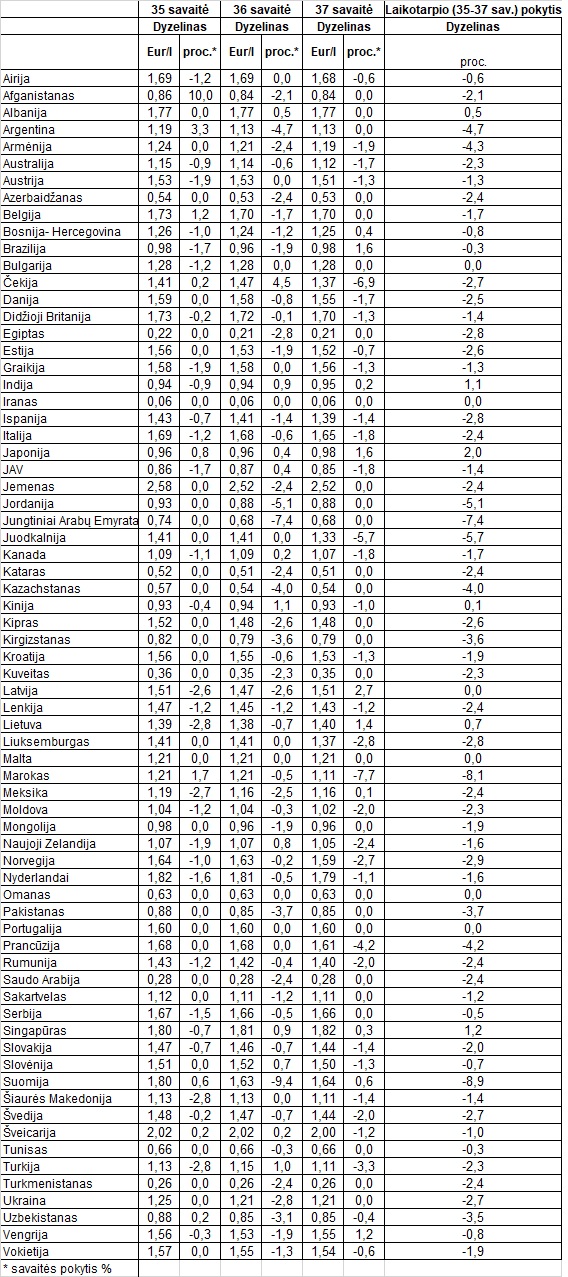 Tarptautinės kelių transporto sąjungos (IRU) duomenimis, 2024 m. 37 savaitę dyzelinas Latvijoje pabrango 2,7 proc., Japonijoje ir Brazilijoje – 1,6 proc., Lietuvoje – 1,4 proc., o Maroke atpigo 7,7 proc.