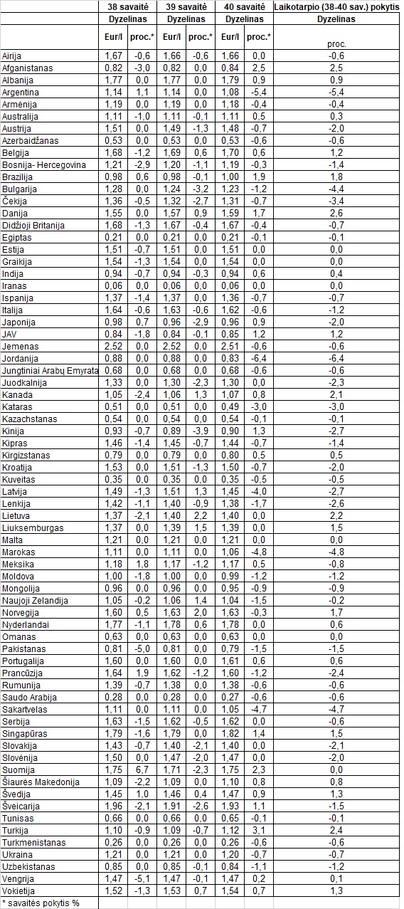 Tarptautinės kelių transporto sąjungos (IRU) duomenimis, 2024 m. 40 savaitę dyzelinas Turkijoje pabrango 3,1 proc., Afganistane – 2,5 proc., Suomijoje – 2,3 proc., o Jordanijoje atpigo 6,4 proc.