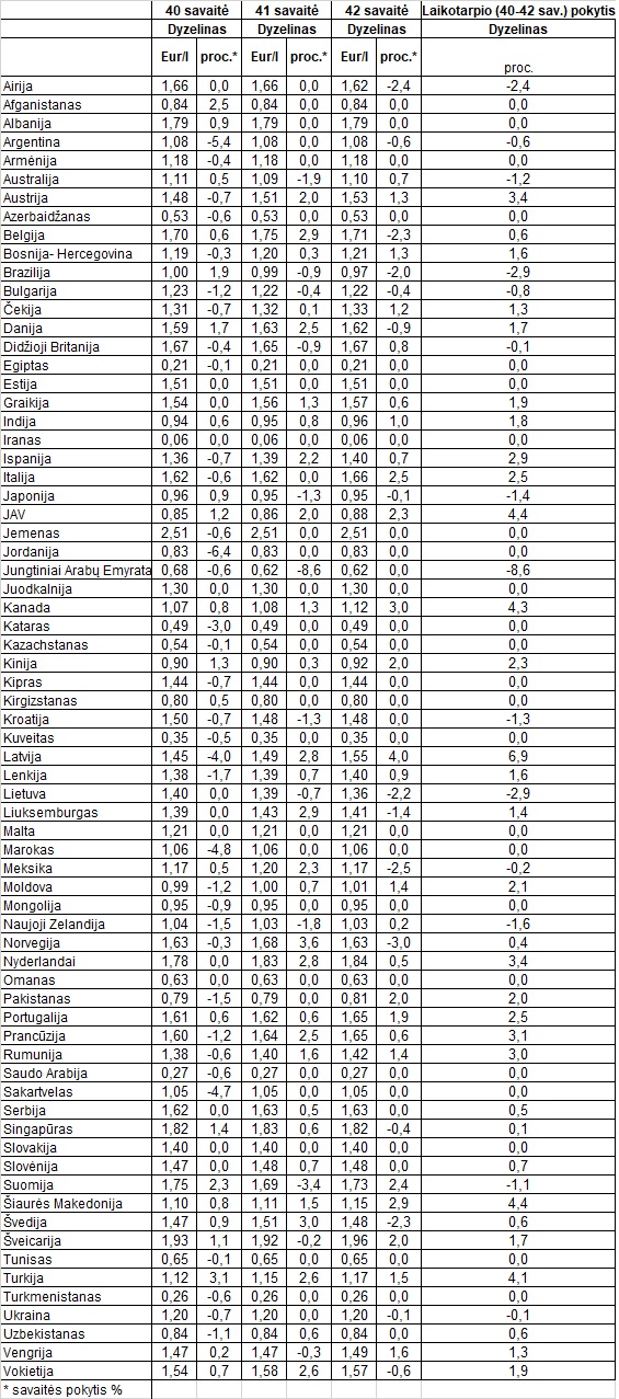 Per analizuojamą laikotarpį (2024 m. 40 – 42 savaites) dyzelinas Latvijoje pabrango 6,9 proc., Šiaurės Makedonijoje ir JAV – 4,4 proc., Kanadoje – 4,3 proc., o Jungtiniuose Arabų Emyratuose atpigo 8,6 proc.