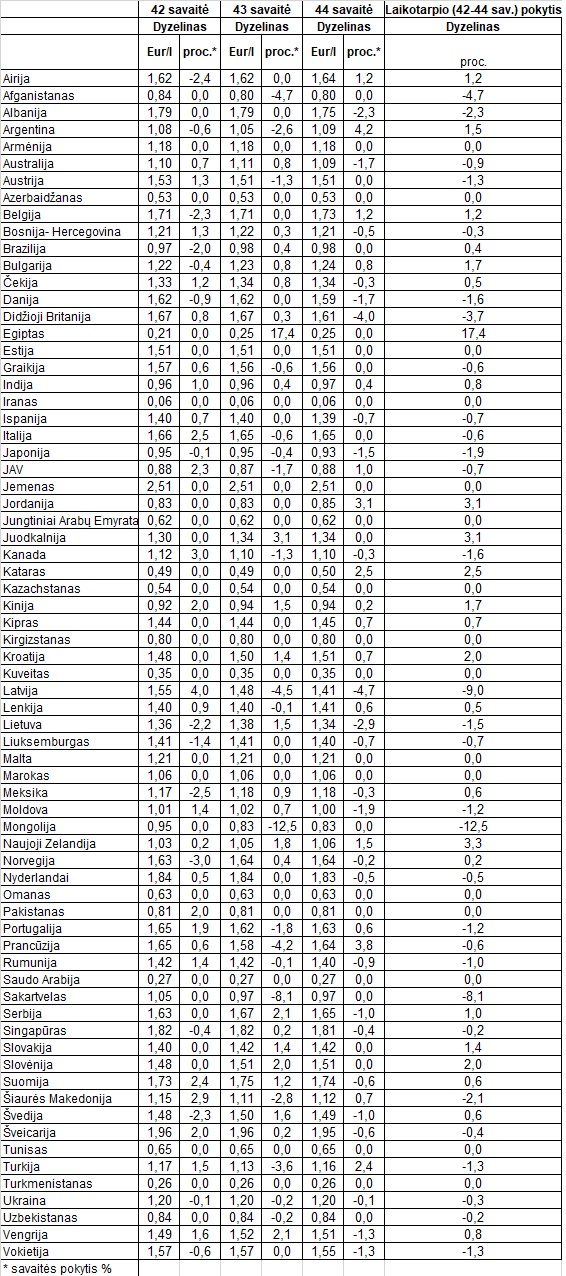 Tarptautinės kelių transporto sąjungos (IRU) duomenimis, 2024 m. 44 savaitę dyzelinas Argentinoje pabrango 4,2 proc., Prancūzijoje – 3,8 proc., Jordanijoje – 3,1 proc., o Latvijoje atpigo 4,7 proc.