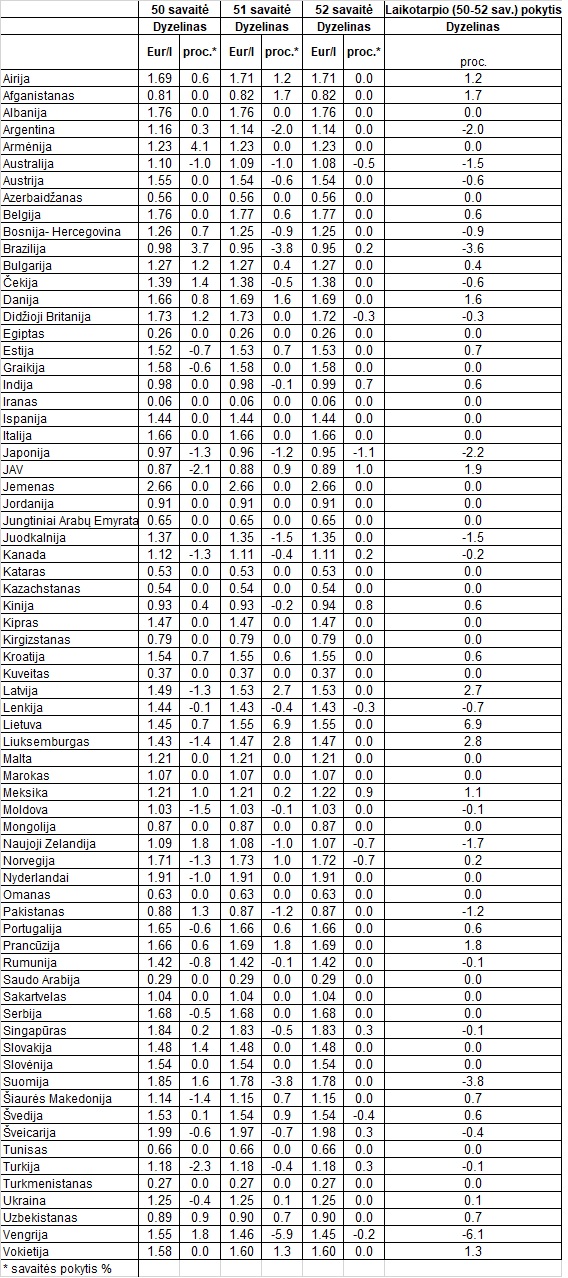 Degalų kainos ES ir kitų šalių rinkose 2024 m. 50–52 savaitėmis
