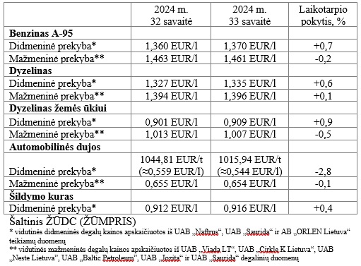 2024 m. 33 savaitę didmeninėje prekyboje vidutinės degalų (išskyrus automobilių dujų) kainos didėjo. Didmeninė dyzelino kaina analizuojamu laikotarpiu padidėjo 0,6 proc., dyzelino žemės ūkiui – 0,9 proc., šildymo kuro – 0,4 proc., benzino A-95 – 0,7 proc., o automobilių dujų – sumažėjo 2,8 proc. Palyginti su 2023 m. atitinkamu laikotarpiu didmeninė dyzelino kaina padidėjo 1,1 proc., šildymo kuro – 2automobilių dujų– 20,0 proc., o dyzelino žemės ūkiui ir benzino A-95 – sumažėjo, atitinkamai 6,7 proc. ir 1,1 proc.