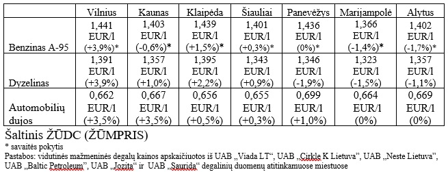 Mažmeninėje prekyboje 2024 m. 36 savaitę vidutinės degalų (išskyrus dyzelino žemės ūkiui) kainos didėjo. Mažmeninė dyzelino kaina analizuojamu laikotarpiu padidėjo 0,5 proc., benzino A-95 – 0,3 proc., automobilių dujų – 1,2 proc., o dyzelino žemės ūkiui – sumažėjo 0,2 proc. Palyginti su 2023 m. atitinkamu laikotarpiu mažmeninė dyzelino žemės ūkiui kaina sumažėjo 15,3 proc., benzino A-95 – 11,0 proc., dyzelino – 11,1 proc., o automobilių dujų – padidėjo 15,8 proc.