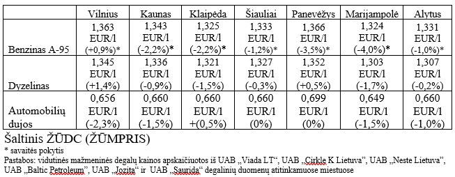 Mažmeninėje prekyboje 2024 m. 38 savaitę vidutinės degalų (išskyrus dyzelino žemės ūkiui) kainos taip pat mažėjo. Mažmeninė dyzelino kaina analizuojamu laikotarpiu sumažėjo 0,4 proc., benzino A-95 – 1,9 proc., automobilių dujų – 2,2 proc., o dyzelino žemės ūkiui – padidėjo 1,8 proc. Palyginti su 2023 m. atitinkamu laikotarpiu mažmeninė dyzelino žemės ūkiui kaina sumažėjo 21,6 proc., benzino A-95 – 16,9 proc., dyzelino – 17,3 proc., o automobilių dujų – padidėjo 12,6 proc.