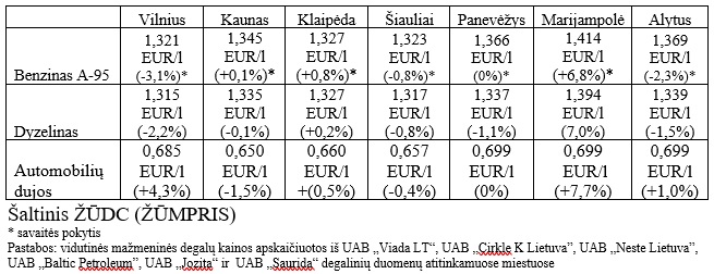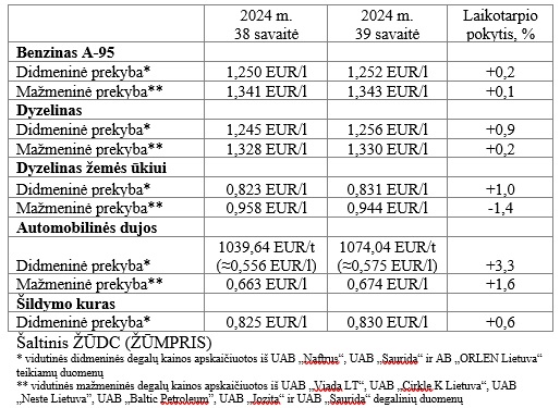 2024 m. 39 savaitę didmeninėje prekyboje vidutinės degalų kainos didėjo. Didmeninė dyzelino kaina analizuojamu laikotarpiu padidėjo 0,9 proc., dyzelino žemės ūkiui – 1,0 proc., šildymo kuro – 0,6 proc., benzino A-95 – 0,2 proc., o automobilių dujų – 3,3 proc. Palyginti su 2023 m. atitinkamu laikotarpiu didmeninė dyzelino kaina sumažėjo 18,7 proc., šildymo kuro – 26,2 proc., dyzelino žemės ūkiui – 29,0 proc., benzino A-95 – 17,6 proc., o automobilių dujų – padidėjo 9,8 proc.
