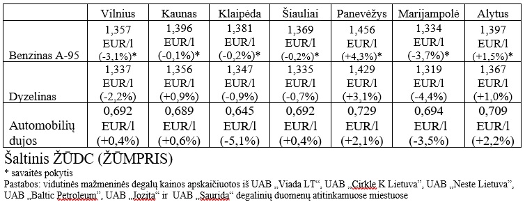 Mažmeninėje prekyboje 2024 m. 44 savaitę vidutinės degalų kainos mažėjo. Mažmeninė dyzelino kaina analizuojamu laikotarpiu sumažėjo 0,5 proc., dyzelino žemės ūkiui – 0,2 proc., benzino A-95 – 0,2 proc., o automobilių dujų – 0,4 proc. Palyginti su 2023 m. atitinkamu laikotarpiu mažmeninė dyzelino žemės ūkiui kaina sumažėjo 22,7 proc., benzino A-95 – 9,7 proc., dyzelino – 12,4 proc., o automobilių dujų – padidėjo 12,9 proc.