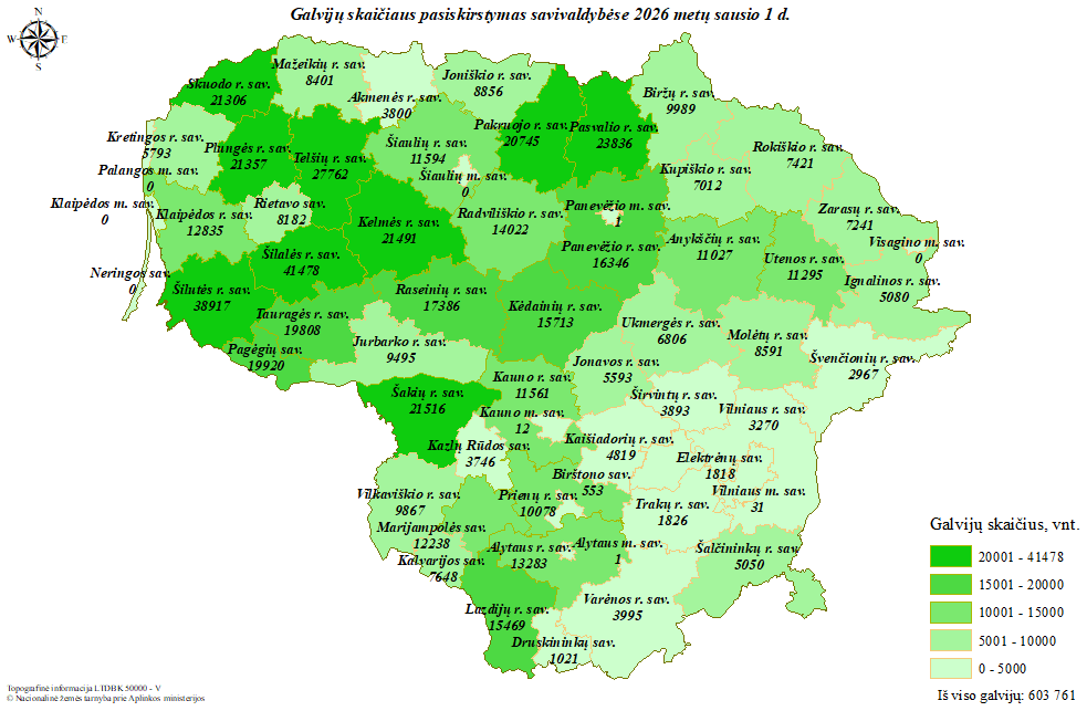 Pagrindinis » Statistika » Galvijų skaičiaus pasiskirstymas savivaldybėse 2026 m. sausio 1 d.