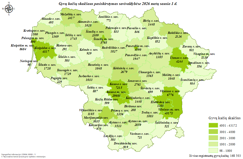 Pagrindinis » Statistika » Kačių skaičiaus pasiskirstymas savivaldybėse 2026 m. sausio 1 d.