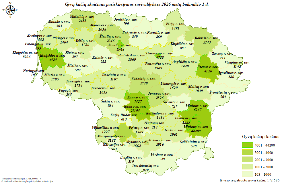 Pagrindinis » Statistika » Kačių skaičiaus pasiskirstymas savivaldybėse 2026 m. balandžio 1 d.