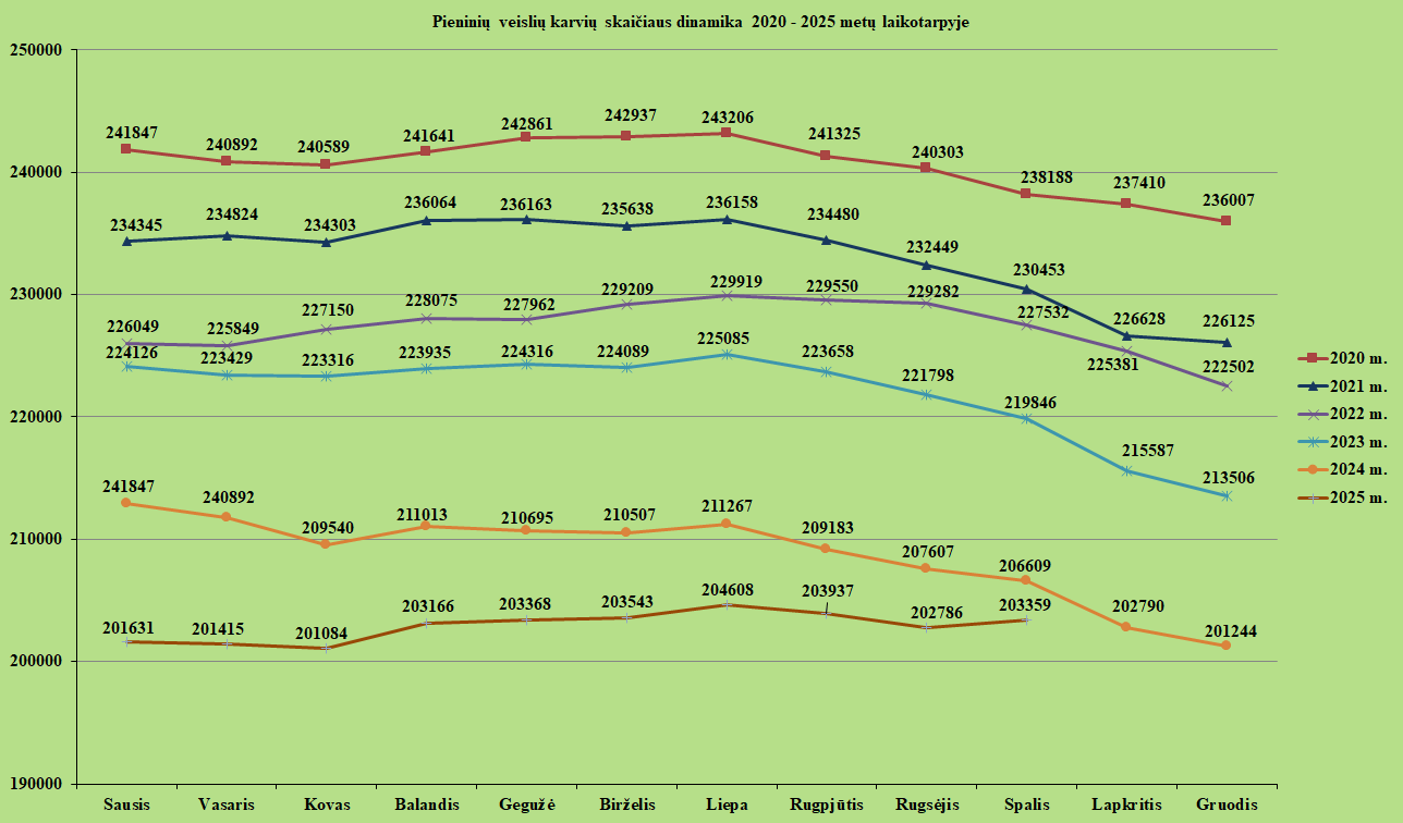 Pagrindinis » Statistika » Pieninių veislių karvių skaičiaus dinamika 2020 – 2025 metais