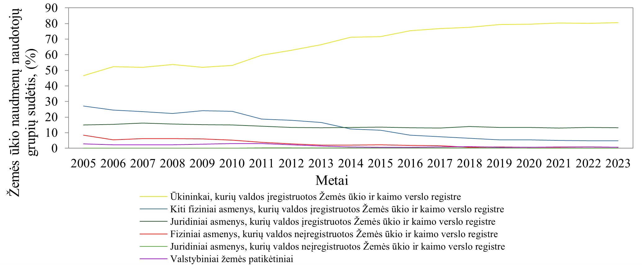 Žemės ūkio naudmenų naudotojų didžiausią dalį sudarė ūkininkai, kurių valdos įregistruotos Žemės ūkio ir kaimo verslo registre (2 pav.). Šių žemės ūkio naudmenų naudotojų kiekis padidėjo nuo 47% (2005 m.) iki 81% (2023 m.).