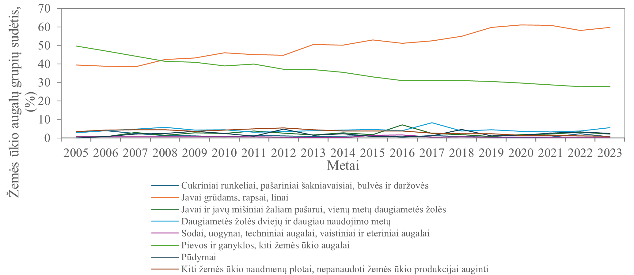 Atlikti stebėjimai parodė, kad nuo 2005 iki 2023 m. pievų ir ganyklų, kitų žemės ūkio augalų plotai tendencingai mažėjo, kai javų grūdams, rapsų, linų plotų daugėjo ir 2023 m. sudarė net 60% (1 pav.) viso tirto ploto. Kitų augalų grupių plotai užėmė labai mažą teritoriją, o pasikeitimai buvo nežymūs.